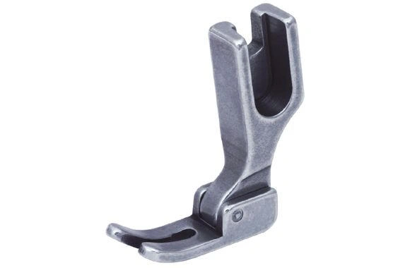 The Narrow Left Compensating Presser Foot (style 142058N) is designed for precise topstitching and edge stitching. Its offset left-raising sole ensures even, consistent seam placement along fabric edges, while the built-in thread groove provides clearance for heavier threads. The yielding left toe improves fabric control over varying thicknesses, and the screw-on, high-shank design guarantees stability for industrial applications.
