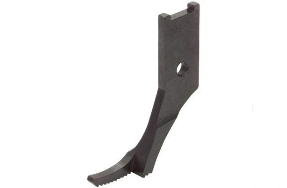 Professional outside walking foot with teeth for industrial sewing machines. Features 5/16" specification and works in sync with needle bar and feed dog to move thick fabrics smoothly. Secures fabric in place between feeding cycles. Essential for heavy-duty materials, leather, and multi-layer projects requiring even feed on both top and bottom layers.